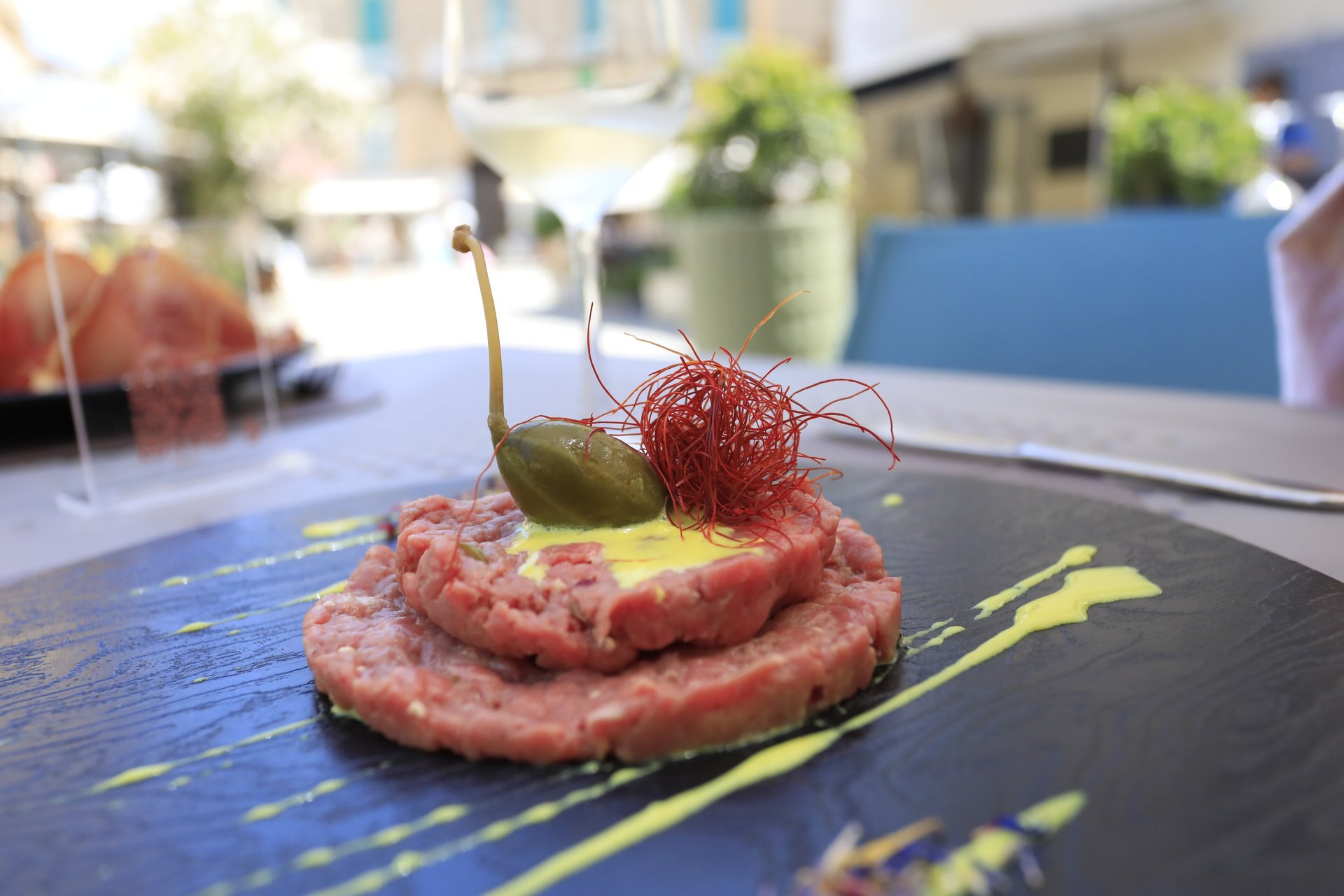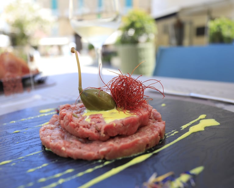 Fassona tartare seasoned with Pantelleria capers, Tropea onion, EVO oil and carbonara sauce