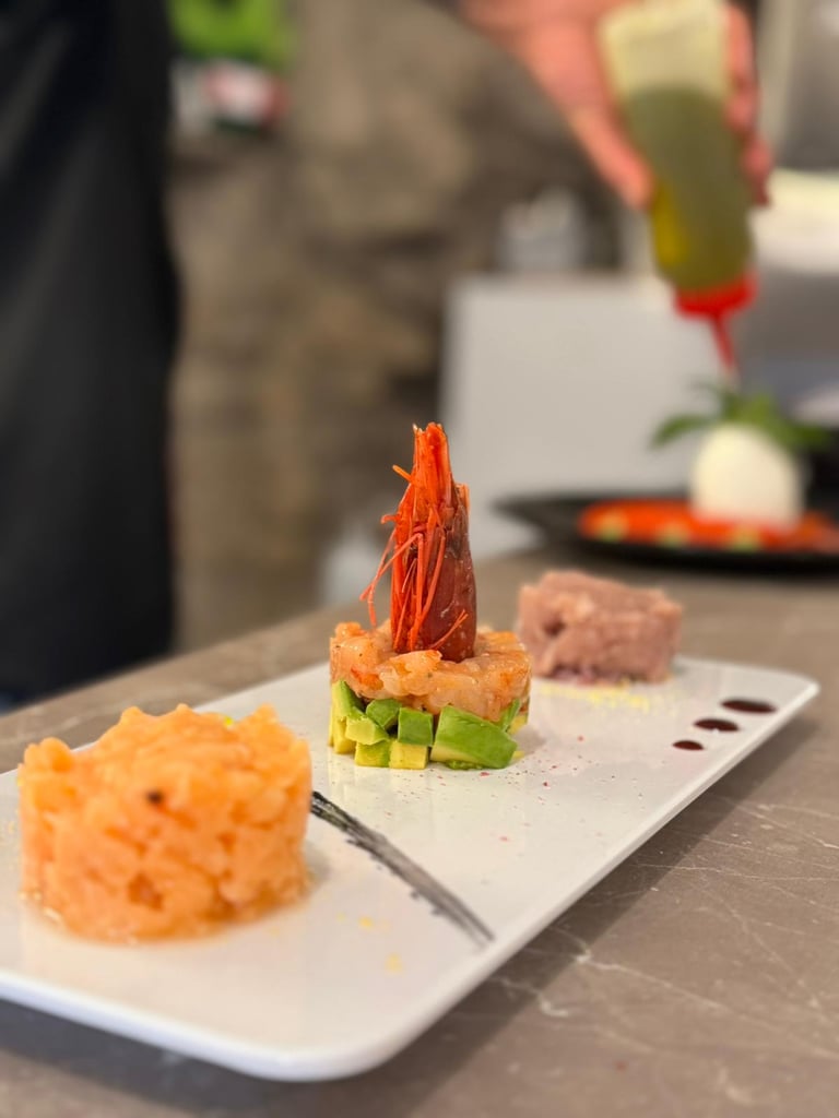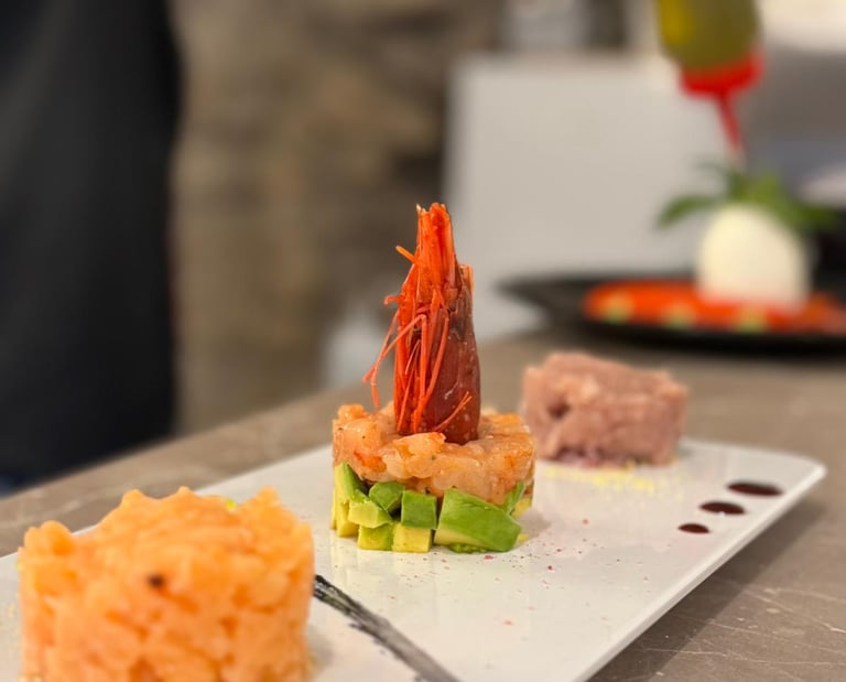 Mazara red prawn tartare - Red tuna tartare - Salmon tartare served with sauce of the day