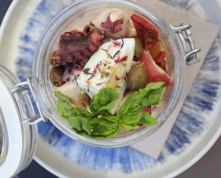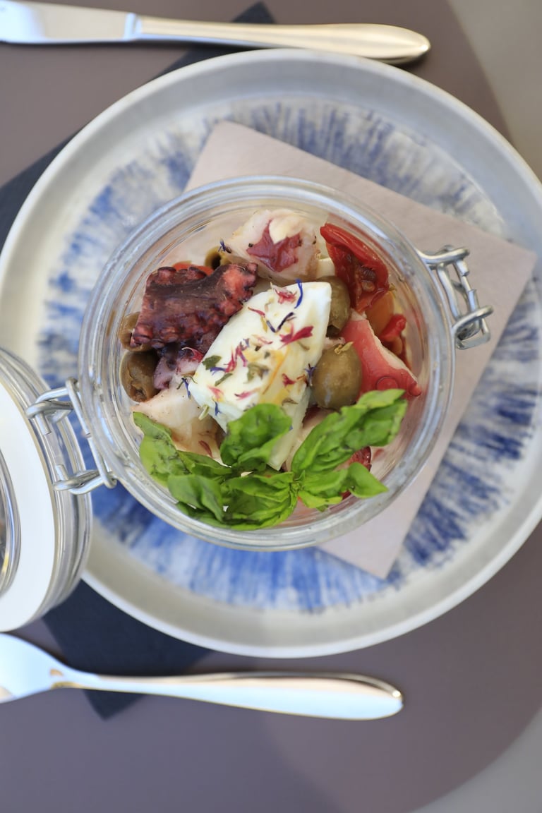 Seared octopus, buffalo mozzarella, Taggiasca olives, confit cherry tomato, basil extract