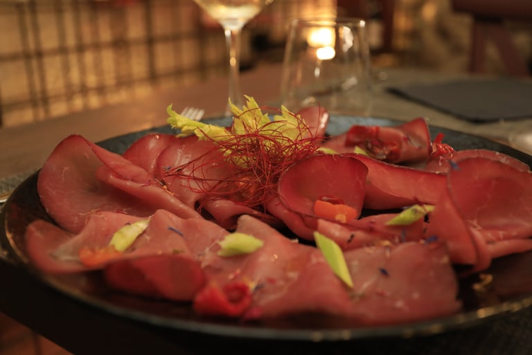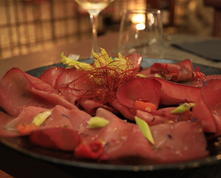 Bresaola from Valtellina, crunchy celery, confit cherry tomatoes, flakes of Parmesan, EVO oil and lemon